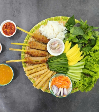 Nem nướng Nha Trang là món ăn đặc sản nổi tiếng của thành phố biển, với thịt heo xay nhuyễn ướp gia vị đậm đà. xiên que và nướng trên than hồng tỏa hương thơm quyến rũ. Món ăn được thưởng thức kèm bánh tráng, rau sống tươi mát, dưa chua và chén nước chấm sánh mịn đặc trưng, tạo nên hương vị khó quên cho thực khách.