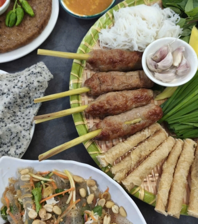 🍢 Nem nướng Nha Trang ở đây nổi tiếng với vị thơm lừng, ăn kèm bánh tráng, rau sống và chén nước chấm đặc biệt pha theo công thức gia truyền, khiến ai ăn một lần cũng nhớ mãi.